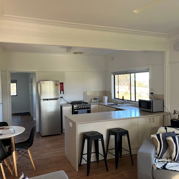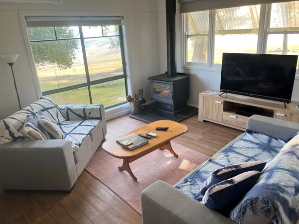 The kitchen and living area is open plan. The lounge has a smart TV, a two and three seater lounge and bean bags are also in the cottage for more seating. Split system air conditioning, Jindara wood heating, Foxtel and free WIFI.